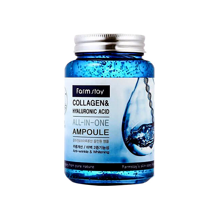 آمپول کلاژن و هیالورونیک اسید فارم استی یک آمپول مراقبتی کاربردی حاوی کلاژن دریایی به عنوان ماده اصلی تشکیل دهنده آن است که بسیار شبیه به ساختار پوست میباشد. یکی دیگر از مواد تشکیل دهنده محتوی این محصول، هیالورونیک اسید است. هیالورونیک اسید میتواند بافتهای آسیب دیده پوست را ترمیم کند به علاوه قادر است تا با خواص آبرسانی و مرطوب کنندگی قوی خود، خشکی پوست را از بین ببرد و باعث افزایش خواص کشسانی پوست فرد مصرف کننده شود.