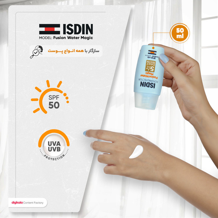 ضد آفتاب ایزدین با بافتی فوق العاده سبک و فینیشی ابریشمی است. با فیوژن واتر MAGIC SPF50 از پوست خود محافظت کنید. به راحتی با پوست ترکیب می شود و محافظت بالایی در برابر اشعه های خورشید دارد. همچنین خاصیت مرطوب کنندگی و اثر آنتی اکسیدانی برای پوست ایجاد می کند. به سرعت جذب پوست میشود و اثر چربی روی پوست باقی نمی گذارد و چشم را تحریک نمی کند. این محصول غیر کومدون زا و بدون چربی نیز میباشد.