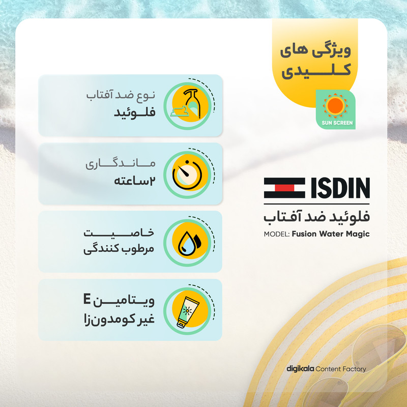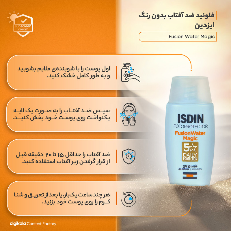 ضد آفتاب ایزدین با بافتی فوق العاده سبک و فینیشی ابریشمی است. با فیوژن واتر MAGIC SPF50 از پوست خود محافظت کنید. به راحتی با پوست ترکیب می شود و محافظت بالایی در برابر اشعه های خورشید دارد. همچنین خاصیت مرطوب کنندگی و اثر آنتی اکسیدانی برای پوست ایجاد می کند. به سرعت جذب پوست میشود و اثر چربی روی پوست باقی نمی گذارد و چشم را تحریک نمی کند. این محصول غیر کومدون زا و بدون چربی نیز میباشد.